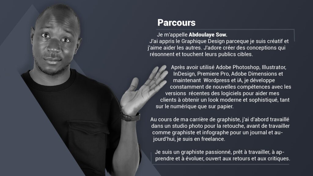J’ai appris le Graphique Design parceque je suis créatif et j’aime aider les autres. J’adore créer des conceptions qui résonnent et touchent leurs publics cibles.